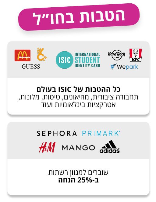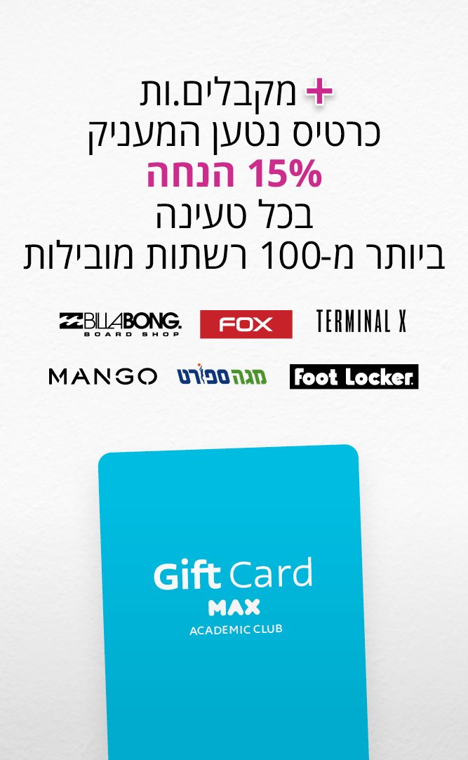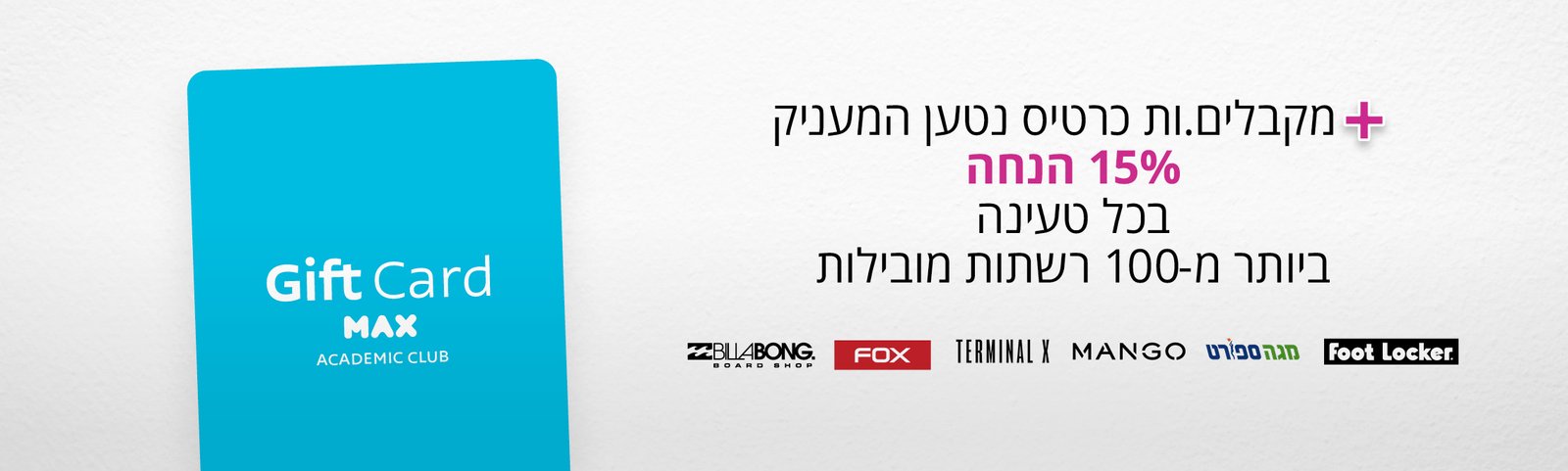 אי עמידה בפירעון האשראי עלולה להוביל לריבית פיגורים והוצאה לפועל. הנפקת הכרטיס מותנית באישור המנפיק מקס איט פיננסים בע״מ | הטבת מתנות ההצטרפות מותנית בכפוף לביצוע עסקה ראשונה בכרטיס, לאחר ביצוע העסקה יש לפנות לשירות הלקוחות שלנו בטלפון 03-7507506 או בווצאפ מספר 0505442121 כדי לקבל את ההטבה | תוקף ההטבה הינו עד ה-2.11.2025 | כתובת – חיים לבנון 58 תל אביב | טל – 03-7507506 | *ט.ל.ח